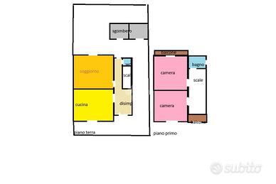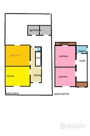 Al primo piano sono presenti due camere da letto, una servita da balcone che si affaccia sul giardino e un bagno con doccia. In corpo distaccato sono presenti vani servizi e un locale di sgombero. Il giardino si sviluppa sul retro della casa e consente di essere adattato sia a zona relax, sia ad orto.