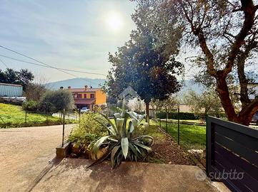 Lo scoperto si divide tra una zona piastrellata, perfetta per parcheggio auto ed una zona verde con un delizioso giardinetto estivo.