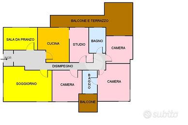 Gli ambienti sono grandi, luminosi e facilmente personalizzabili. Dall'ingresso si accede ad un tinello, ad un'ampia cucina abitabile con balcone e ad una camera ad uso studio; il soggiorno è spazioso e accogliente, valorizzato dal camino che crea una bella atmosfera per conversare o trascorrere una tranquilla serata in famiglia.