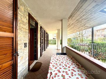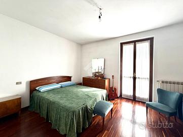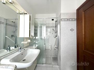 Sempre al piano terra troviamo una comoda camera matrimoniale con accesso al giardino e un bagno finestrato con doccia doppia.