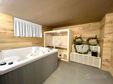 Al piano seminterrato veniamo accolti dalla grande taverna con camino a legna, lavanderia e zona wellness con sauna e vasca idromassaggio.