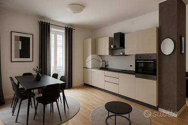 L'appartamento si apre su un'ampia zona giorno open-space, che unisce soggiorno e cucina, creando un ambiente luminoso e accogliente.