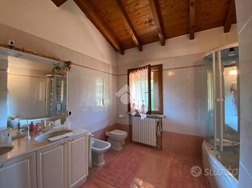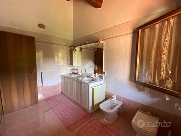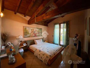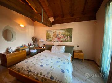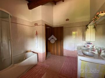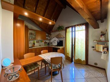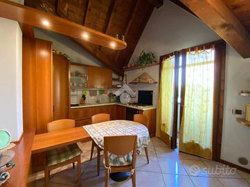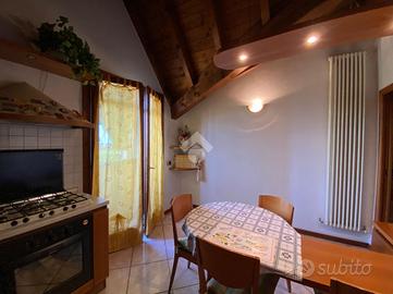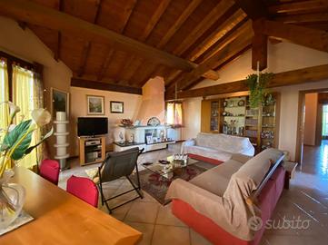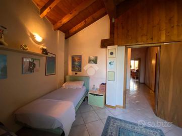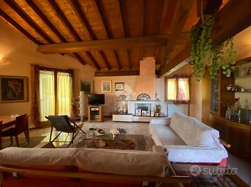 Al piano primo, l'abitazione offre zona living con accogliente camino e travi a vista, cucina separata ed abitabile, due camere da letto e doppi servizi, garantendo spazi funzionali e ben organizzati.