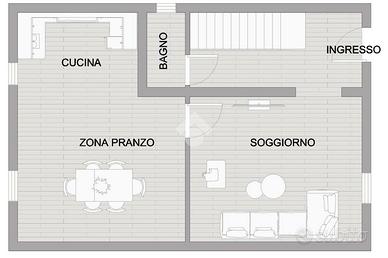 al piano terra la zona giorno composta da ingresso, soggiorno, cucina spaziosa ed abitabile e da un primo bagno.