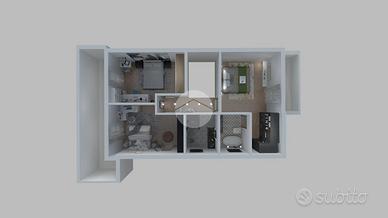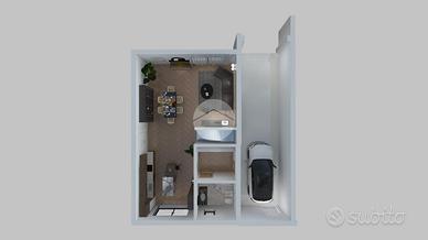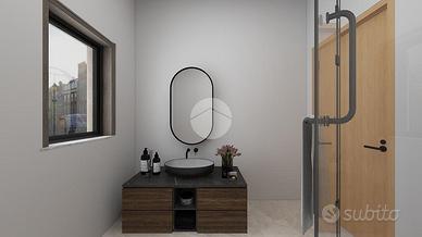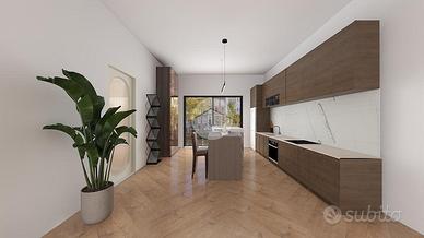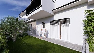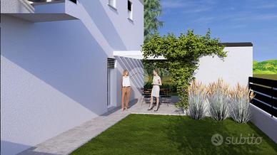 L'elegante progetto delle ville non prevede piano interrato e la soluzione avrà sviluppo su due livelli. Dall'ingresso pedonale indipendente si accede al piccolo cortile frontale. L'ingresso è diretto nella zona giorno, aperta sulla parete cucina e resa luminosa dalle ampie vetrate con affaccio sul giardino posteriore. Il bagno di servizio, con anti bagno/lavanderia, completa il piano. Al livello superiore si sviluppa l'intera zona notte composta da tre camere, con la padronale impreziosita da bagno privato. L'ulteriore bagno al piano, serve le altre due camere. I balconi sono due, uno per la camera padronale, il secondo che serve entrambe le camere più piccole. Il box al piano terra è doppio in lunghezza, attrezzato con serranda motorizzata, ed accesso alla parte abitativa da una porta interna.