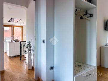 Al piano terra l'ingresso conduce in un open-space composto da soggiorno con angolo cottura, illuminato da tre punti luce e porte finestre che permettono l'uscita diretta sulla terrazza e sulla corte esterna pavimentata.