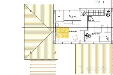 La soluzione è così composta: al piano terra accediamo al soggiorno con accesso al giardino retrostante, cucina ampia ed un primo bagno, mentre al piano di sopra troviamo 2 camere da letto e 2 bagni.