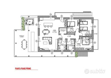 La porzione al piano primo avrà un giardino privato con scala di accesso alla zona abitativa composta da una spaziosa zona living di 46 mq, 3 camere da letto, 2 bagni con finestra e ripostiglio.