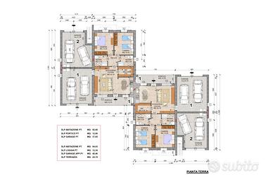 Il progetto prevede due unità site al piano terra con box auto doppio di proprietà e corte esclusiva e due unità che si sviluppano al piano primo, sempre con ingresso indipendente, con accesso all'abitazione tramite la scala interna prevista nell'autorimessa di proprietà.