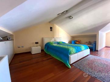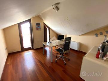 Il secondo appartamento si sviluppa su più livelli. Al piano terra troviamo un ingresso con area studio, un luminoso soggiorno, una cucina a vista e un bagno. Da qui si accede a un terrazzo panoramico, perfetto per godere di pranzi e cene all'aperto. Al primo piano due spaziose camere da letto - di cui una con cabina armadio - una cameretta, bagno finestrato con vasca idromassaggio e due balconi. La mansarda ospita un'ulteriore camera da letto, un secondo spazio studio e bagno con doccia.