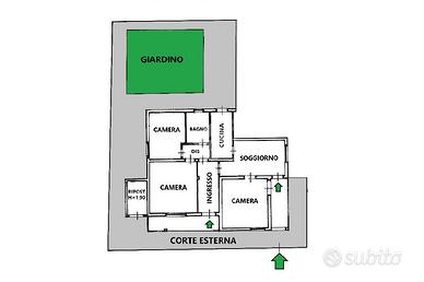 L'abitazione, con un esposizione su quattro lati, si completa di corte esterna pavimentata e giardino di circa 50 mq.
