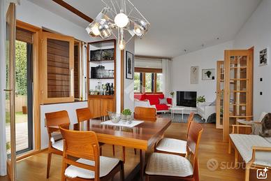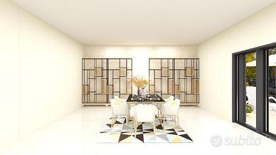 Al piano rialzato la zona giorno è composta da ingresso, cucina abitabile con terrazzo, studio, bagno e ampio salotto con una terrazza di mq 41.