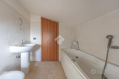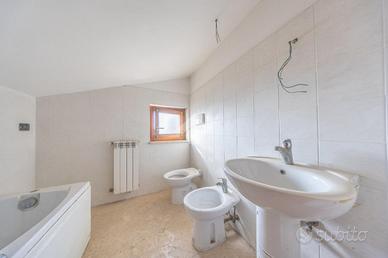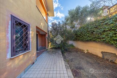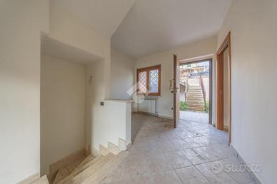 Proseguendo, la zona notte offre due camere luminose, ideali per famiglie o per chi desidera uno studio personale, accompagnate da un secondo bagno. Al livello seminterrato, parzialmente fuori terra, si apre invece un ampio ambiente che si presta a diventare il cuore della casa, una grande zona giorno con bagno dedicato e accesso a un secondo giardino, prevalentemente mattonato, perfetto per momenti all'aperto, cene estive o semplicemente per un angolo di relax.