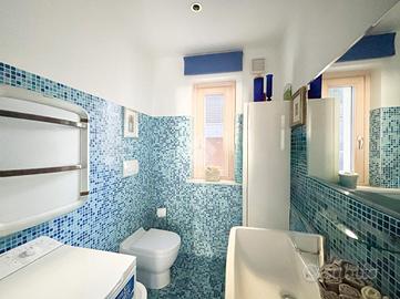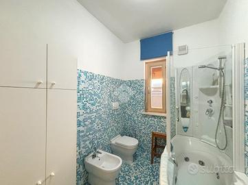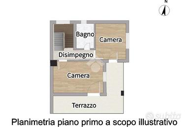 Da una scala a vista si sale al primo piano con due camere da letto e un bagno, completo di vasca doccia idromassaggio e finestrato; dalle due camere si esce sul terrazzo del piano.