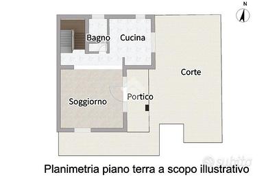 La soluzione si sviluppa su più livelli. Tramite un cortile esterno pavimentato si giunge all'ingresso al piano terra che ospita la zona giorno composta da un luminoso living, una comoda cucina abitabile e un bagno di servizio, finestrato e con antibagno.
