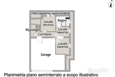 Inoltre al piano seminterrato si trovano la taverna con due locali, un bagno con doccia, il garage con almeno due posti di 40 mq (lnghezza oltre 6 m), locale tecnico e vano ripostiglio.