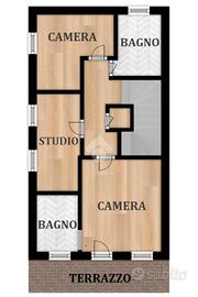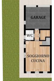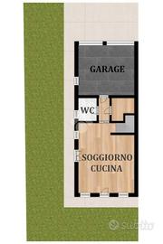 Al piano terra si apre un ampio open-space di circa 33 mq, con soggiorno e cucina integrati in un unico ambiente conviviale, arricchito da grandi aperture che conducono al giardino privato, perfetto per trascorrere momenti di relax all'aperto. Il piano è completato da un bagno finestrato, un comodo ripostiglio e l'accesso diretto alla doppia autorimessa. Inoltre possibile ampliare la zona giorno e realizzare una cucina separata utilizzando una parte del garage, creando così una luminosa vetrata che dona ulteriore ariosità e luce naturale all'ambiente, mantenendo comunque un'autorimessa singola.