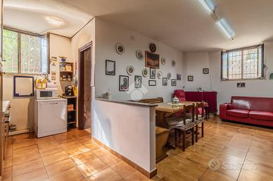 Proseguendo troviamo uno studio, già predisposto per essere utilizzato come cucina, con uscita sul retro della villa, e una zona pranzo con angolo cottura, camino e bagno di servizio finestrato.
