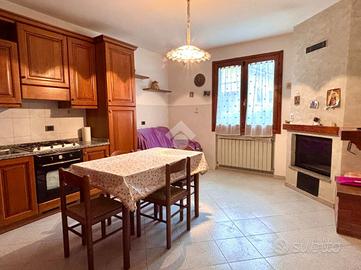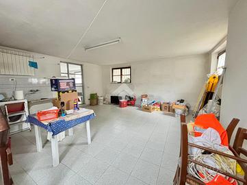 Attraverso la terrazza d'ingresso si accede all'ampio soggiorno di c. ca 25 mq, un ambiente luminoso e ben distribuito. La cucina è abitabile, dotata di termocamino installato nel 2018 e con accesso al terrazzo. Sullo stesso livello è presente un bagno di servizio finestrato con doccia.