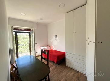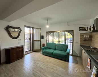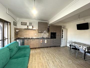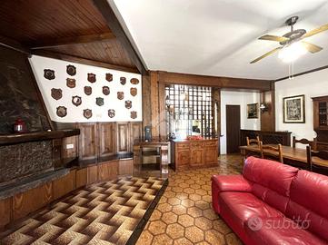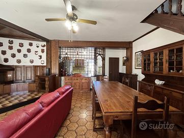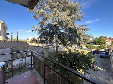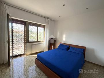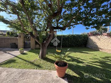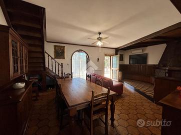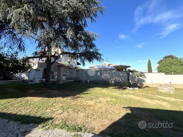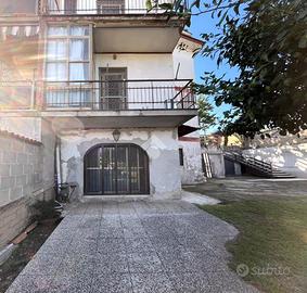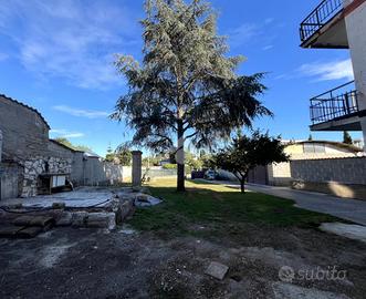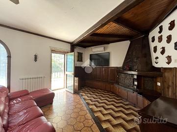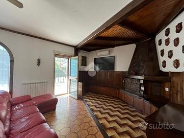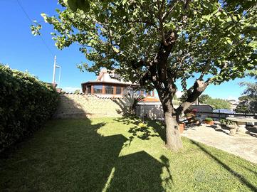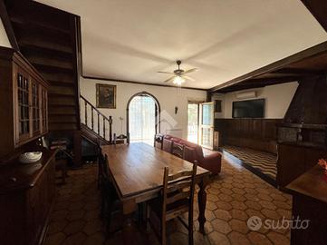 L'ingresso si apre su un'area verde esclusiva, creando un ambiente perfetto per famiglie, amanti del verde o chi desidera un ampio spazio esterno da sfruttare durante tutto l'anno. L'abitazione si sviluppa su due livelli e si distingue per un ampio soggiorno di c.a. 50 mq, in stile rustico, caratterizzato da travi a vista, rivestimenti in legno e un elegante camino in pietra, che dona un'atmosfera calda e accogliente. Un pratico angolo bar completa il salone, offrendo il luogo ideale per momenti conviviali e di relax. La zona giorno è completata da un cucinotto ben organizzato e funzionale, separato da una parete decorativa in legno, con accesso diretto al balcone e al ripostiglio tramite una portafinestra. Completa il piano un comodo bagno di servizio, dotato di finestra. Al piano superiore, salendo tramite una comoda scala, si trova la zona notte, composta da tre ampie camere da letto, di cui una con accesso diretto al balcone privato. Da questo balcone si accede al lastrico solare, pavimentato e dotato di un pannello di c.a. 400 litri per l'acqua calda. Le altre due camere sono servite da un balcone in comune, che necessita di essere completato, e da un secondo bagno finestrato, provvisto di vasca. Il giardino conduce, tramite una scala esterna, a due strutture aggiuntive. La prima è una dependance, di c.a. 45 mq, attualmente accatastata come box auto, che offre numerose possibilità di utilizzo: può essere trasformata in uno studio, una zona relax o anche in un piccolo appartamento per ospiti. La seconda struttura ospita un magazzino di circa 103 mq, che fornisce ampi spazi e potrebbe essere convertito in un altro tipo di locale, a seconda delle necessità. Entrambe le strutture sono sepa.
