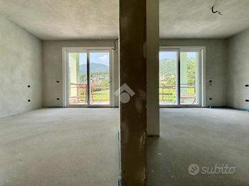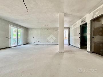 L'immobile, articolato su tre livelli, è ottimamente esposto e soleggiato e gode di ottima vista panoramica sul verde circostante. Al piano terra è presente la zona living openspace di circa 52 mq calpestabili comprendenti cucina a vista, sala da pranzo e salotto, con accesso al giardino da tutti i lati dell'abitazione, disimpegno, ripostiglio e bagno finestrato con doccia per un totale di oltre 65 mq su un unico livello. L'area esterna, di oltre 300 mq, comprende porticato di 25 mq, plateatico privato di 100 mq e verde esclusivo piantumabile di circa 200 mq. Il primo piano ospita tre grandi camere da letto di oltre 12 mq tutte con sfogo esterno, di cui una padronale con bagno e accesso diretto alla loggia di circa 18 mq dalla quale si può godere un'invidiabile vista aperta sul verde circostante. Un secondo bagno serve le restanti stanze da letto e un pratico e funzionale ripostiglio funge da disbrigo. Al piano interrato si fa spazio la taverna finestrata, la funzionale lavanderia ed il grande box auto di oltre 40 mq.