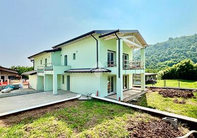 OME - Ubicata in località Valle, attraversata dai torrenti Gandovere e Martignago, nella zona collinare dove si snodano boschi, prati e panorami mozzafiato, sorge nuova e moderna villa bifamiliare realizzata in piena classe A e contraddistinta da dettagli predisposti alla massima efficienza energetica e sostenibilità.
