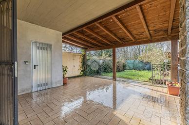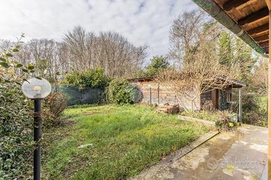 Al piano terra l'ingresso conduce ad un luminoso soggiorno con angolo cottura, valorizzato da una doppia vetrata affacciata sul giardino, che dona luce naturale e un'atmosfera accogliente all'ambiente. Dalla zona giorno è inoltre presente un'uscita sullo spazio esterno posteriore, in parte coperto da una tettoia in legno e in parte adibito a giardino. Completa il piano un comodo bagno di servizio.