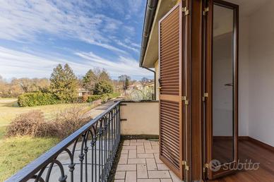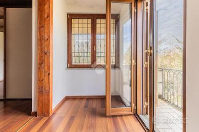 Il piano superiore, collegato da scala interna, ospita una camera matrimoniale con possibilità di realizzare una cabina armadio o uno studio, una cameretta e un bagno con doccia. Entrambe le camere dispongono di balcone privato con affaccio sul giardino e sul verde circostante