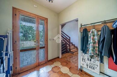 L'ingresso, posto al pianterreno e dotarto di portico , apre sul corridoio che porta sull'ampio e luminoso soggiorno con camino e la cucina semi abitabile .