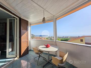 Una scala esterna conduce alla zona giorno: spaziosa, luminosa e accogliente. L'ambiente comprende un'ampia area pranzo, un angolo soggiorno con divano e TV, e una cucina separata e completamente accessoriata. Completano il piano due terrazzi e un balcone comodo, tra cui uno dei terrazzi è stato chiuso con vetrate panoramiche, da cui si gode una vista impareggiabile sul mare e sull'Isola di Dino: un vero quadro naturale da ammirare comodamente seduti.
