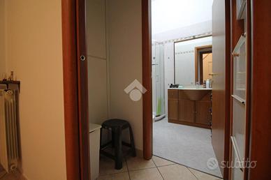 Varcando l'ingresso a comune, passando quindi dal primo dei due resedi, veniamo accolti da un disimpegno dove troviamo i due ingressi della bifamiliare.