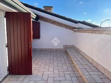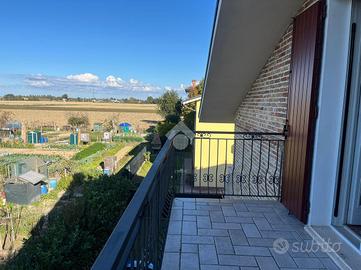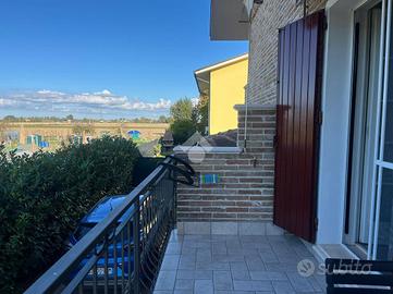 Ingresso rialziato che conduce al porticato al piano primo, con accesso diretto alla zona giorno e alla cucina abitabile, con annesso balcone. Sullo stesso piano abbiamo la prima camera matrimoniale, anch'essa con balcone e primo bagno finestrato con vasca.