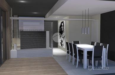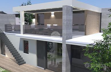 Al piano terra, concepito in ottica estremamente funzionale, troviamo un ampio salone con angolo cottura e serra bioclimatica per offrire il massimo della luminosità interna, due bagni finestrati, una camera matrimoniale ed una cameretta.