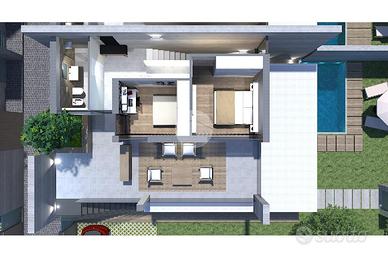 Al piano superiore, collegato tramite una scala d'arredo 'Mobirolo - Rexal' e predisposto per accogliere unicamente la zona notte, troviamo un locale adibito a camera matrimoniale, un locale adibito a cameretta ed un bagno finestrato; completerà il piano un ampio terrazzo con piscina.