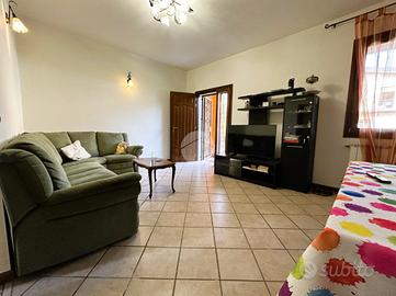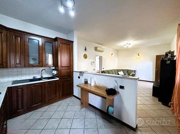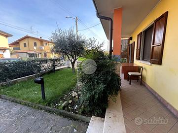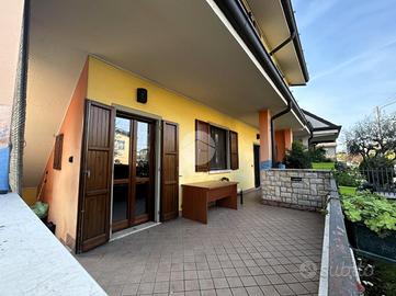 La proprietà è arricchita da un giardino privato frontale che si estende fino al portico, offrendo un piacevole spazio esterno collegato direttamente alla zona giorno. L'ingresso principale apre su un ampio e luminoso soggiorno open space con cucina a vista e accesso diretto al giardino, un ambiente ideale per chi ama la luce naturale e gli spazi aperti.