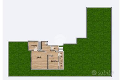 Al piano terra rialzato troviamo una spaziosa zona giorno composta da cucina abitabile, soggiorno con camino, bagno e studio.