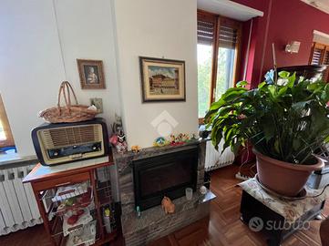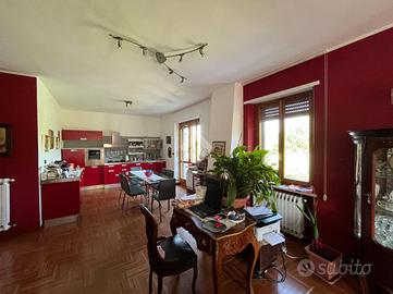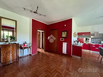 Il suo ingresso, tramite il portoncino, è sul disimpegno che conduce al soggiorno doppio e alla cucina abitabile con affaccio sul balcone. La zona giorno è dotata di un camino a legna ventilato.