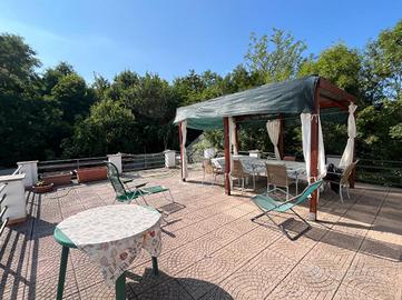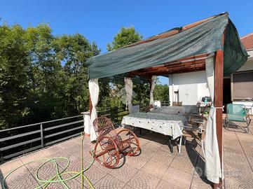 Completano la proprietà il sottotetto grezzo adibito a deposito, il giardino privato adibito a orto, il terrazzo ampio, il posto auto doppio coperto e il box auto.