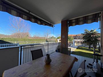 L'ingresso si apre su un ampio soggiorno , cucina abitabile, camera matrimoniale, bagno con vasca e comodo ripostiglio. Tutti gli ambienti del piano hanno uscita diretta sul giardino e sul terrazzo, ideale per pranzi all'aperto grazie alle tende da sole.