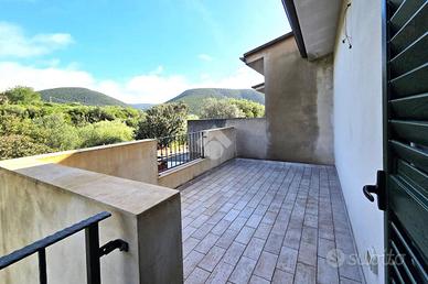 Al primo piano, la zona notte offre due camere da letto, di cui una con terrazzo e suggestiva vista mare, un bagno e un ulteriore terrazzo con vista sulle colline, per godere di scorci naturali e grande luminosità.