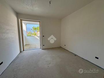 Primo Piano: zona notte pensata per il benessere con tre camere da letto, doppi servizi, una comoda cabina armadio e un generoso terrazzo coperto, ideale per momenti di relax all'aria aperta.