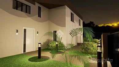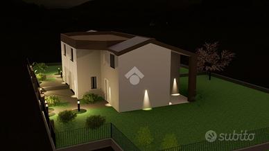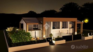 LA CASA CHE HAI SEMPRE SOGNATO COSTRUZIONE A 5 STELLE - LA CASA CHE RESPIRA NZEB Il nuovo complesso residenziale 'Luxury Resort Le Ville Green' sorgerà nella zona Sud del paese, alle spalle del centro storico e prevede la realizzazione di 18 unità abitative, 13 delle quali con accessi pedonali e carrabili indipendenti e ampi giardini di pertinenza. Nello specifico verranno edificate una villa singola, due bifamiliari, una trifamiliare e due piccoli condomini da 5 unità cadauno indipendenti. L'immobile qui proposto è una villa bifamiliare costruita su un lotto di mq 490, di cui ben 337 mq sono destinati a giardino di pertinenza; al piano terra si trova l'ampia zona giorno, il bagno, la lavanderia, due porticati importanti e l'accesso diretto all'autorimessa doppia in larghezza oltre al posto auto coperto da pergolato in legno; al piano primo troviamo le tre camere matrimoniali, il bagno e un'ampia terrazza. La parola d'ordine di questo progetto è 'GREEN ', verrà infatti realizzato con una particolare attenzione al contenimento dei consumi energetici così da classificarsi in Classe ' A4 ' a bolletta zero, in quanto l'energia necessaria per la vostra abitazione sarà garantita da fonti rinnovabili con pompa di calore collegata al fotovoltaico con accumulo. Inoltre sono dotate di un sistema di VMC (ventilazione meccanica) per la sanificazione degli ambienti e la deumidificazione. Questo contesto sembra essere nato già nel FUTURO, ogni particolare sia costruttivo che di finiture è stato prima studiato e pensato, poi scelto per una clientela esigente e sensibile al benessere unico, viziata e coccolata all'efficenza e all'ambiente. Gli elevati standard che s'impone questo progetto hanno portato l'esecutore a scegliere tecnologie costruttive altamente performanti come il sistema costruttivo della CLIMA BLOCK per la muratura e il termosolaio denominato KALDO, materiali ecologici e antibatterici, altamente energetici, con attenzione all' acustica ma sop