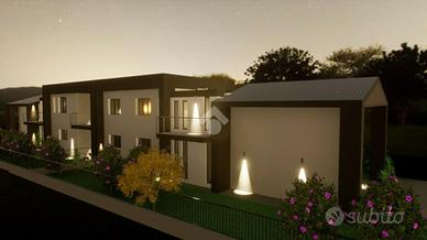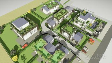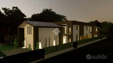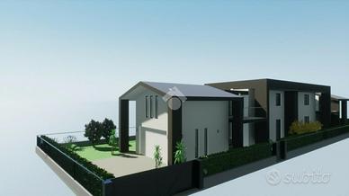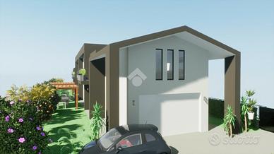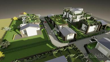 LA CASA CHE HAI SEMPRE SOGNATO COSTRUZIONE A 5 STELLE - LA CASA CHE RESPIRA NZEB Il nuovo complesso residenziale 'Luxury Resort Le Ville Green' sorgerà nella zona Sud del paese, alle spalle del centro storico e prevede la realizzazione di 18 unità abitative, 13 delle quali con accessi pedonali e carrabili indipendenti e ampi giardini di pertinenza. Nello specifico verranno edificate una villa singola, due bifamiliari, una trifamiliare e due piccoli condomini da 5 unità cadauno indipendenti. Soluzioni di varie tipologie e metrature - Ville su due livelli - Appartamenti indipendenti con giardini privati - Appartamenti con ascensore direttamente in casa - Attici con grandi vetrate e terrazzi con giardini a pensili. Nello specifico vi presentiamo una villa abbinata libera su tre lati con giardino di circa 235 mq. L'abitazione è così composta: al piano terra troviamo una ampia zona giorno open space, bagno, disimpegno, ampio porticato ed autorimessa doppia; al Primo piano tre camere da letto, due bagni e due giardini pensili, oltre ad un terrazzo di 75 mq al piano secondo con accesso da uno dei due giardini pensili. La parola d'ordine di questo progetto è 'GREEN ', verrà infatti realizzato con una particolare attenzione al contenimento dei consumi energetici così da classificarsi in Classe ' A4 ' a bolletta zero, in quanto l'energia necessaria per la vostra abitazione sarà garantita da fonti rinnovabili con pompa di calore collegata al fotovoltaico con accumulo. Inoltre sono dotate di un sistema di VMC (ventilazione meccanica) per la sanificazione degli ambienti e la deumidificazione. Questo contesto sembra essere nato già nel FUTURO, ogni particolare sia costruttivo che di finiture è stato prima studiato e pensato, poi scelto per una clientela esigente e sensibile al benessere unico, viziata e coccolata all'efficenza e all'ambiente. Gli elevati standard che s'impone questo progetto hanno portato l'esecutore a scegliere tecnologie costruttive alt