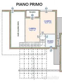 Attraverso una scala interna si accede al piano primo, totalmente agibile e abitabile, di circa 48 mq, che ospita due camere da letto, ciascuna di circa 14 mq, un disimpegno e un secondo servizio finestrato.