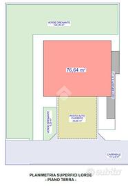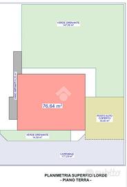 Al piano terra, di circa 77 mq, si trova la zona giorno, composta da un ampio soggiorno di circa 42 mq, una cucina separata e abitabile di circa 15 mq, disimpegno e un servizio finestrato.