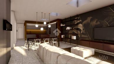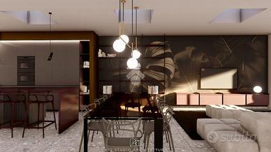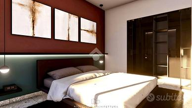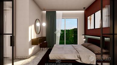 Zona giorno Open Space luminosa con cucina a vista, due ampie camere da letto matrimoniali di cui una con cabina armadio e bagno in camera ed una camera singola, bagno elegante con finiture di ultima generazione e lavanderia.