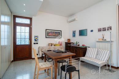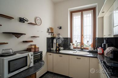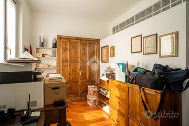 Ampia zona living con doppio soggiorno, cucina abitabile separata, ulteriore ambiente versatile ideale come studio o secondo salotto, e bagno di servizio.