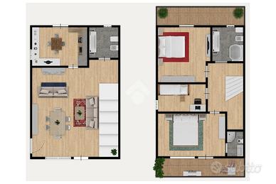La zona notte al primo piano è composta da una camera matrimoniale con accesso al terrazzo, una cameretta adattabile alle proprie esigenze, un bagno finestrato con la vasca ed una camera matrimoniale con il bagno privato con la doccia e con accesso ad un terrazzo.
