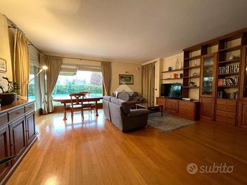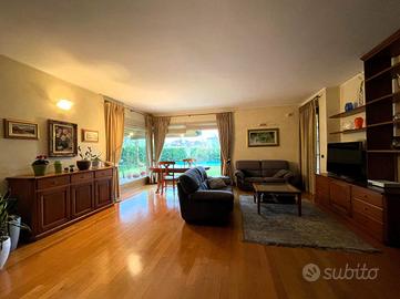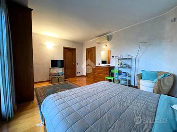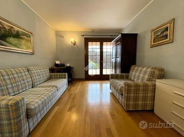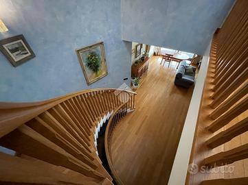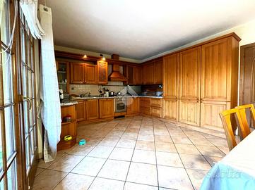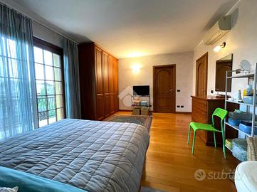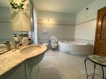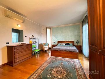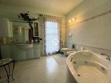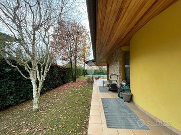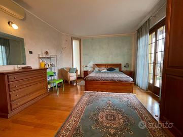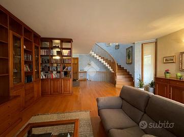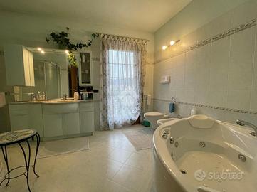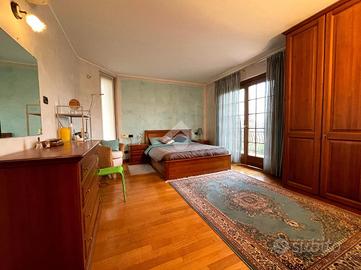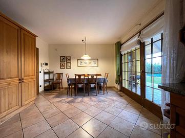 TORRE DE ROVERI Questa porzione di villa bifamiliare di testa si distingue per la posizione riservata e per gli spazi generosi, pensati per garantire comfort e funzionalità in ogni ambiente. Al piano terra si sviluppa la zona giorno, dove l'ingresso conduce a un ampio soggiorno luminoso, affacciato direttamente sul giardino privato. Qui si trova una splendida piscina interrata, ideale per momenti di relax e convivialità all'aperto. La cucina è abitabile e facilmente collegata sia alla zona giorno sia all'esterno, rendendo semplice e piacevole vivere gli spazi durante tutte le stagioni. Sullo stesso livello sono presenti anche un bagno di servizio e uno studio, che grazie all'accesso diretto allo spazio pavimentato esterno può essere utilizzato come area lavoro o come stanza jolly versatile. Una scala maestosa, elemento architettonico di grande impatto, accompagna al primo piano, dove si sviluppa la zona notte. Qui troviamo tre camere da letto: la matrimoniale, particolarmente spaziosa, è dotata di una comoda cabina armadio e si affaccia su un balcone privato; una camera singola, anch'essa con accesso a un secondo balcone; e una terza camera, ideale per chi necessita di maggior spazio o per una stanza dedicata agli ospiti. A servizio del piano vi è un elegante bagno padronale, completo di vasca idromassaggio, perfetto per concedersi momenti di puro benessere. Scendendo al piano interrato si apre un'ampissima taverna, vero cuore conviviale della casa. È attrezzata con cucina, camino e ampi spazi che permettono di organizzare pranzi, feste o semplicemente godere di un ambiente caldo e accogliente durante le stagioni più fredde. Completano il livello un pratico ripostiglio, la lavanderia e un ulteriore bagno, particolarmente utile quando si ospitano amici o familiari. Dal piano interrato si accede infine al box quadruplo, dotato di basculante e cancello elettrici, che offre un notevole spazio di manovra e garantisce la massima comodità per chi possiede pi