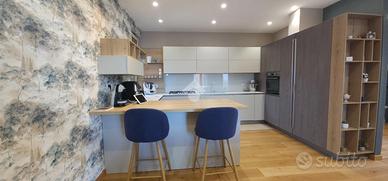 L' ingresso si apre su un ampio soggiorno a vista, impreziosito da un bellissimo caminetto, ideale per vivere momenti di convivialità in un ambiente caldo ed accogliente. La moderna cucina open space è collegata al soggiorno ma, nello stesso tempo, posizionata in un angolo riservato e non immediatamente a vista.